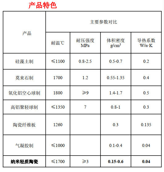 高溫隔熱保溫產(chǎn)品輕量化一直是相關領域研究的熱點,若能突破高溫隔熱產(chǎn)品的輕質化,就有可能實現(xiàn)高溫設備的輕量化以及隔熱產(chǎn)品結構的優(yōu)化,為此我公司研發(fā)的耐高溫納米輕質陶瓷不僅能夠滿足1700℃及以上環(huán)境應用,并且實現(xiàn)產(chǎn)品的輕質化以及高溫環(huán)境的超低導熱系數(shù)(對標目前市場所有產(chǎn)品,具有巨大優(yōu)勢)。